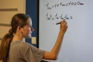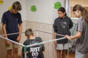 Na innych zajęciach, z nieco starszymi uczniami, budujemy np. metr sześcienny. Dzieci porównują go z centymetrem sześciennym i próbują oszacować, ile takich małych sześcianów wypełni cały duży sześcian. To nie jest abstrakcyjna teoria – to konkret, który mogą zobaczyć i dotknąć, dzięki czemu wiedza staje się dla nich rzeczywista i zrozumiała.