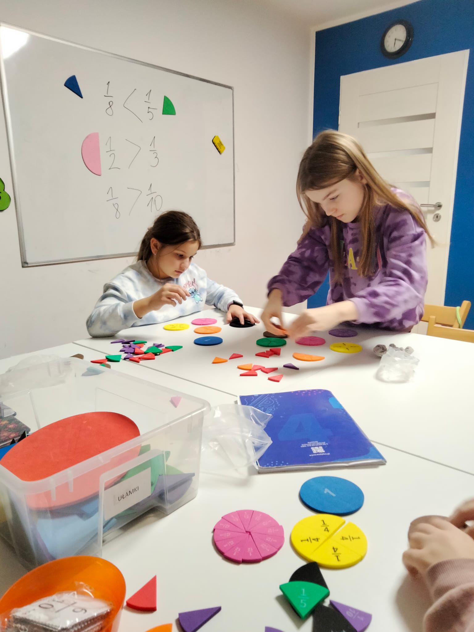 A co z ułamkami? Dzieci dostają między innymi kolorowe koła podzielone na równe części. Najpierw mają wskazać, który ułamek jest większy. Następnie tworzą własne modele – układają ćwiartki, połowy, ósemki i porównują je między sobą. Przeżywają moment „aha!”, gdy nagle widzą, że 2/4 to to samo, co 1/2, oraz gdy 1/12 okazuje się być zdecydowanie mniejsza od 1/3. To bezcenne chwile, bo samodzielnie dochodzą do wiedzy, a nie tylko ją zapamiętują.